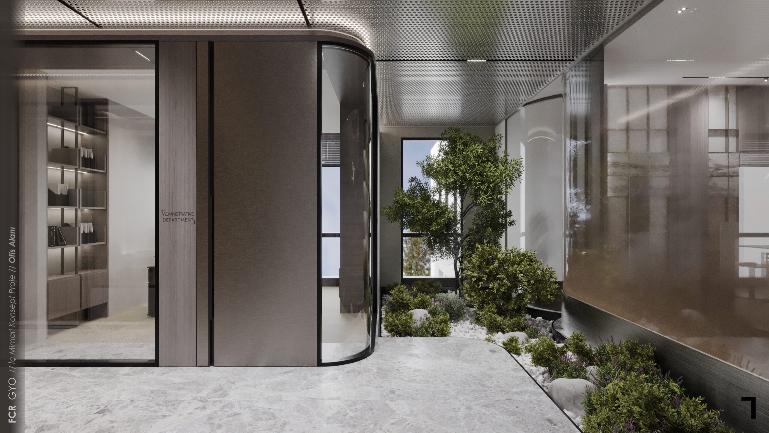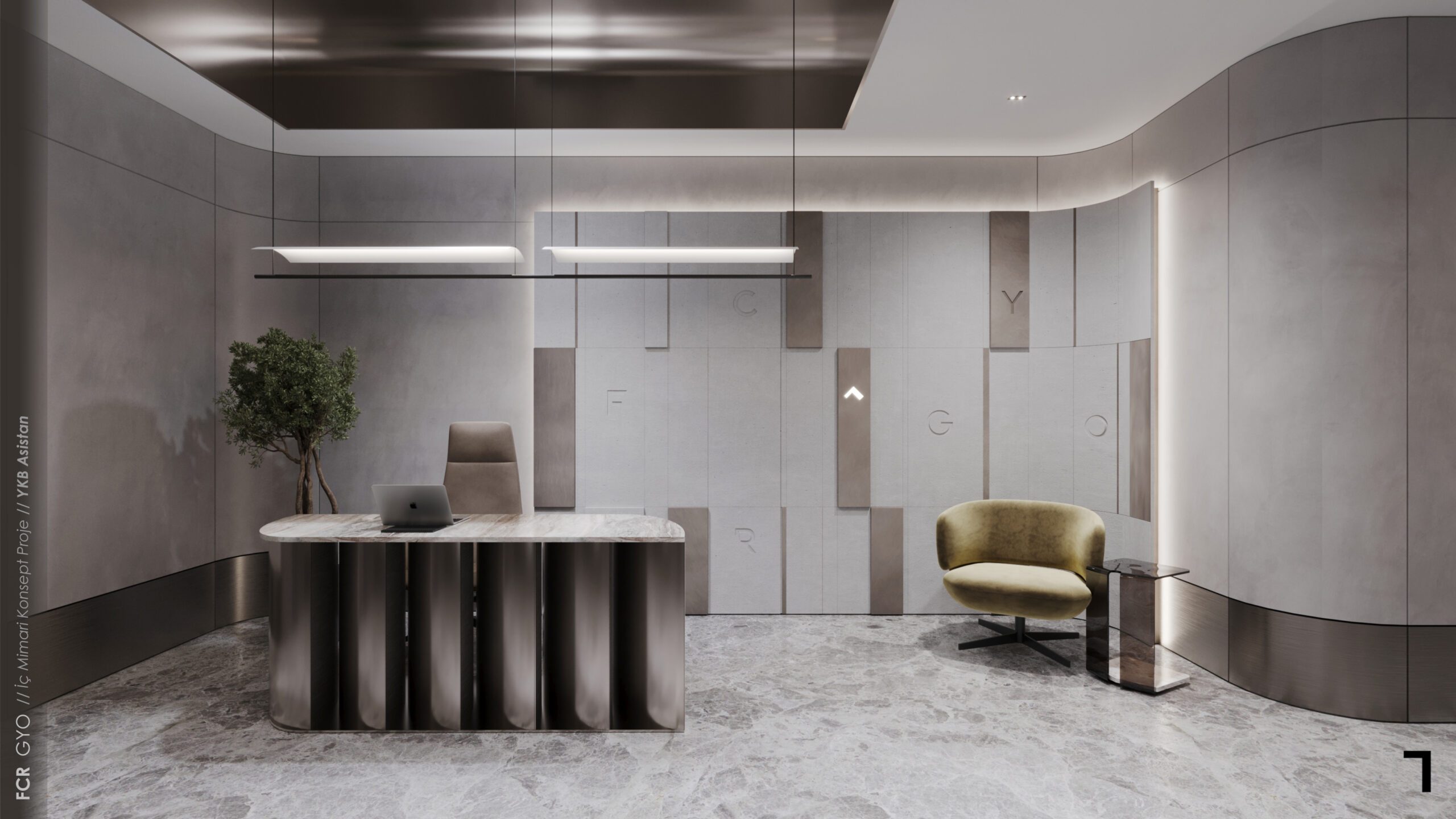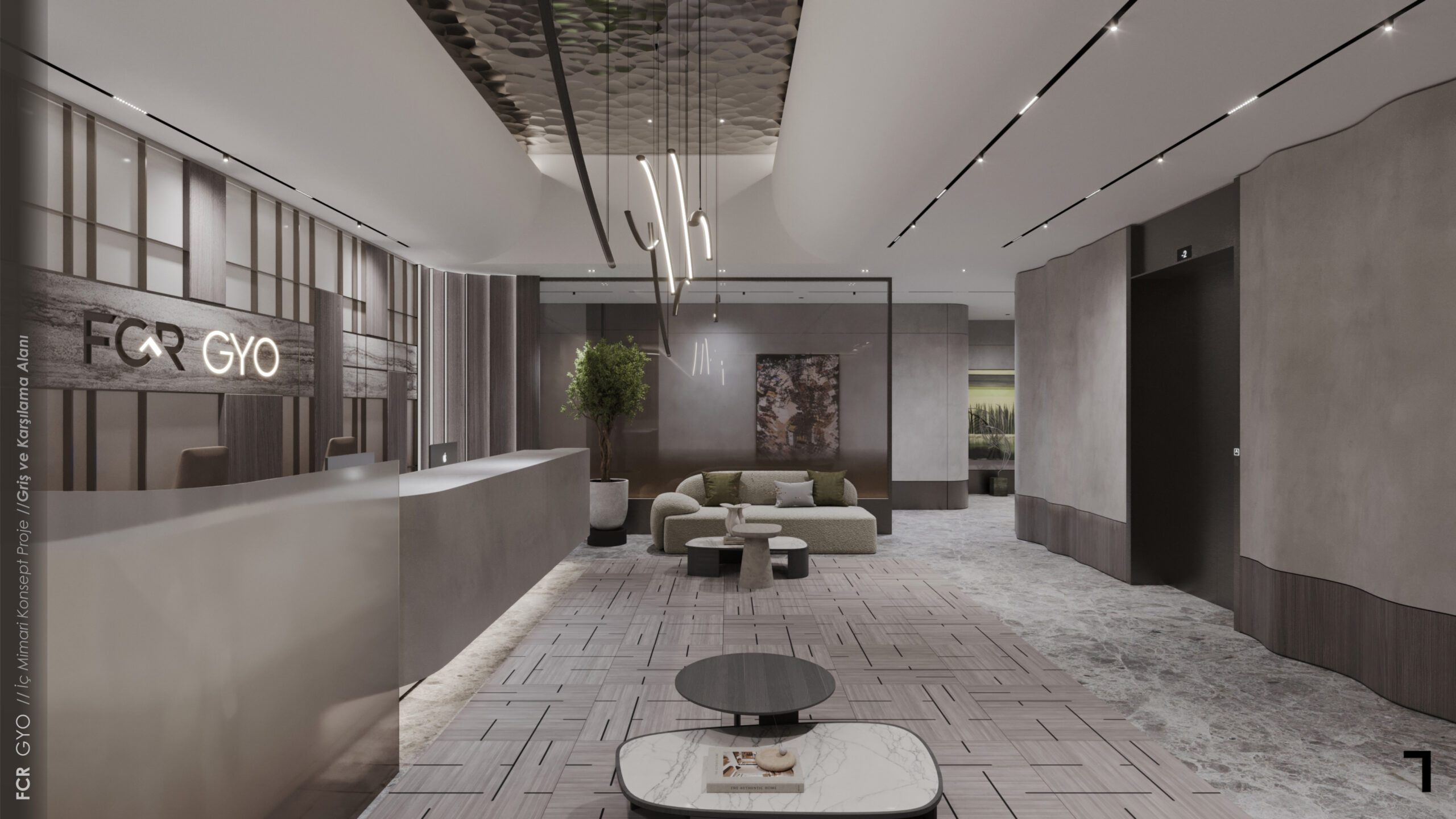 Giriş holü, FCR-GYO’nun kurumsal kimliğini yansıtmaktadır. Minimalist resepsiyon bankosu, zarif aydınlatma elemanları ve organik geçişli oturma düzeni; karşılamayı yalnızca işlevsel değil, aynı zamanda davetkâr kılmaktadır.