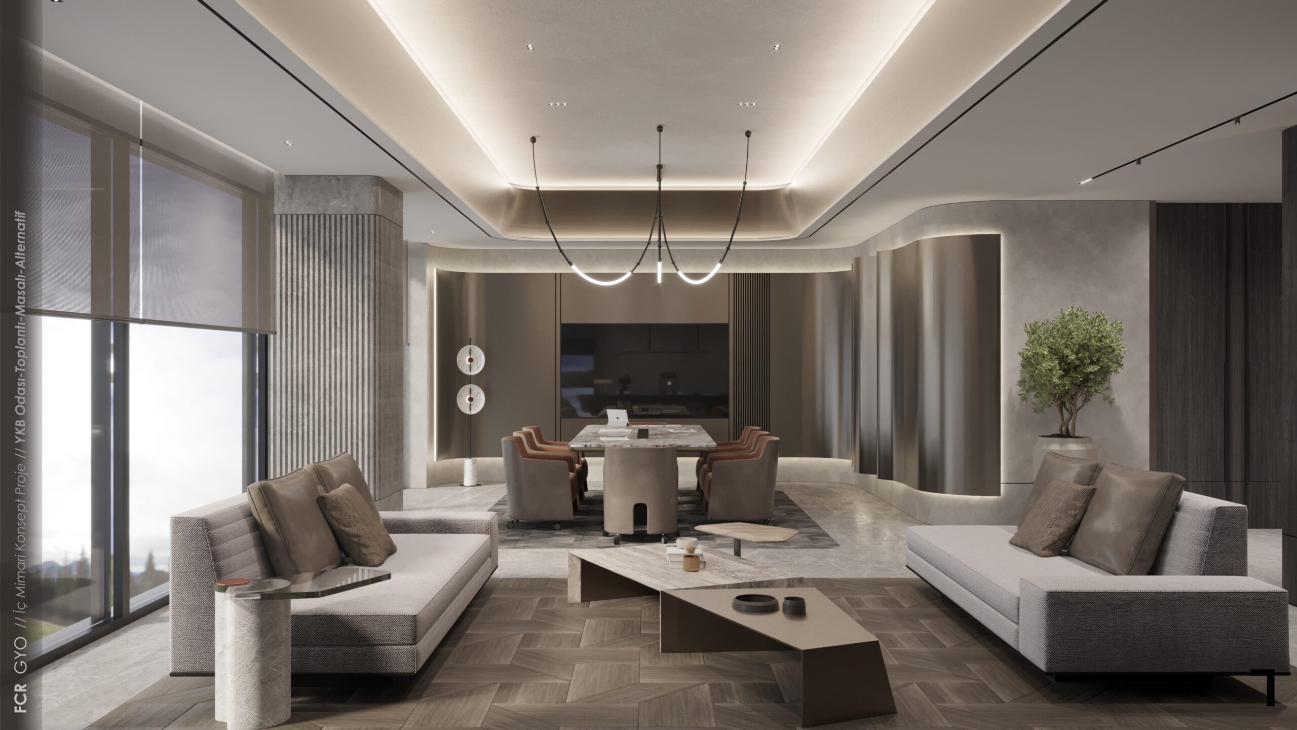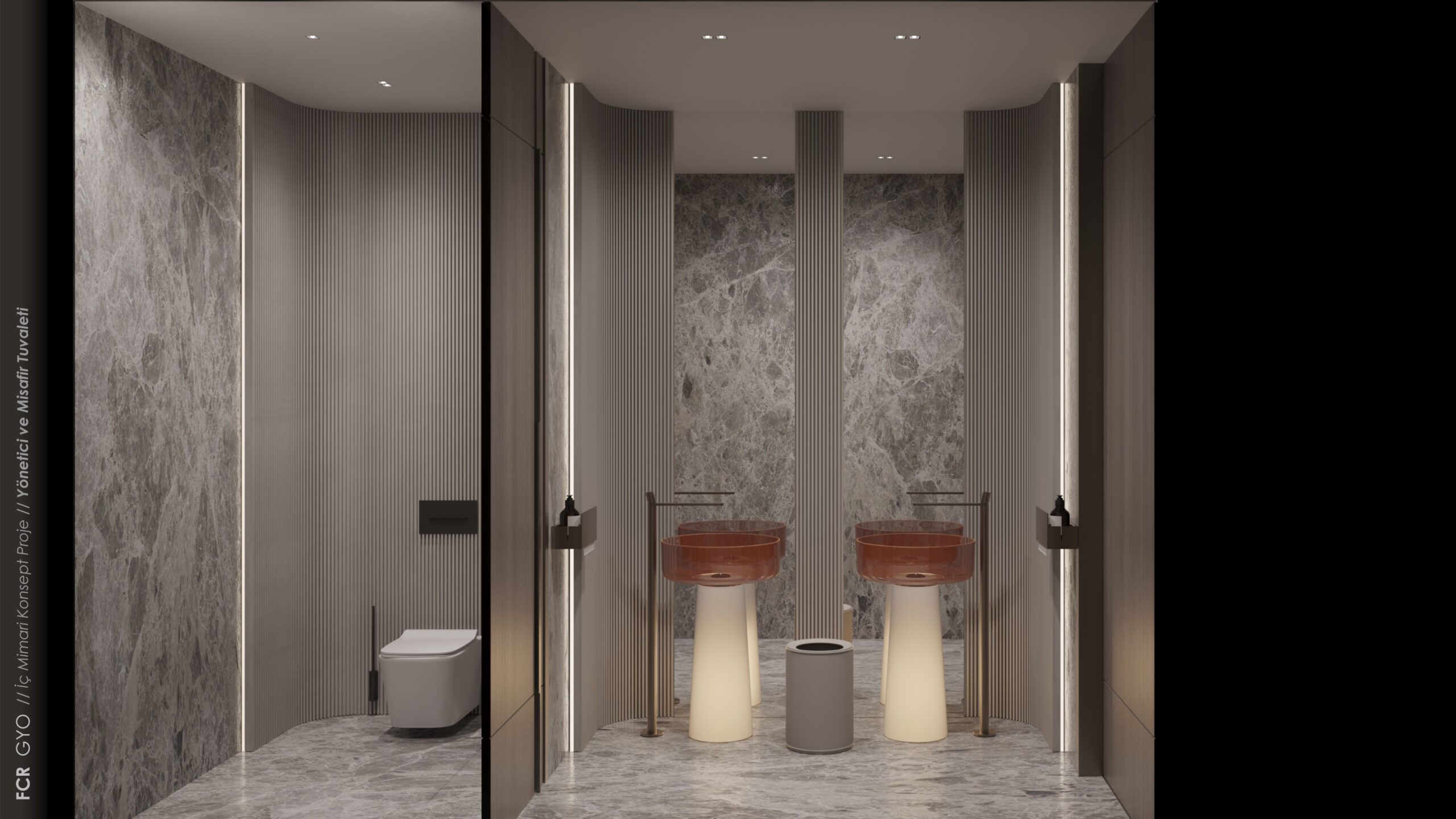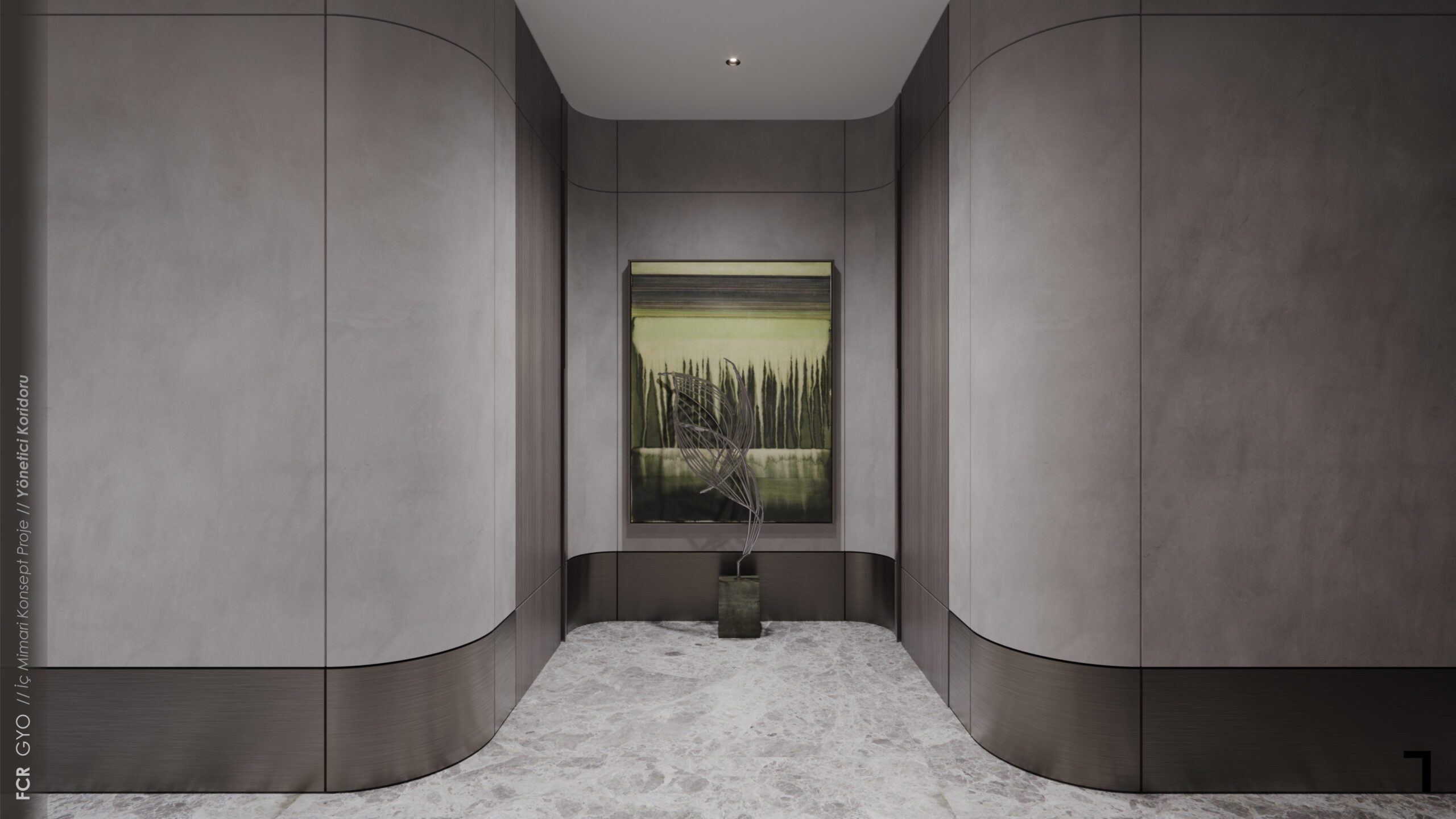 Giriş holü, FCR-GYO’nun kurumsal kimliğini yansıtmaktadır. Minimalist resepsiyon bankosu, zarif aydınlatma elemanları ve organik geçişli oturma düzeni; karşılamayı yalnızca işlevsel değil, aynı zamanda davetkâr kılmaktadır.