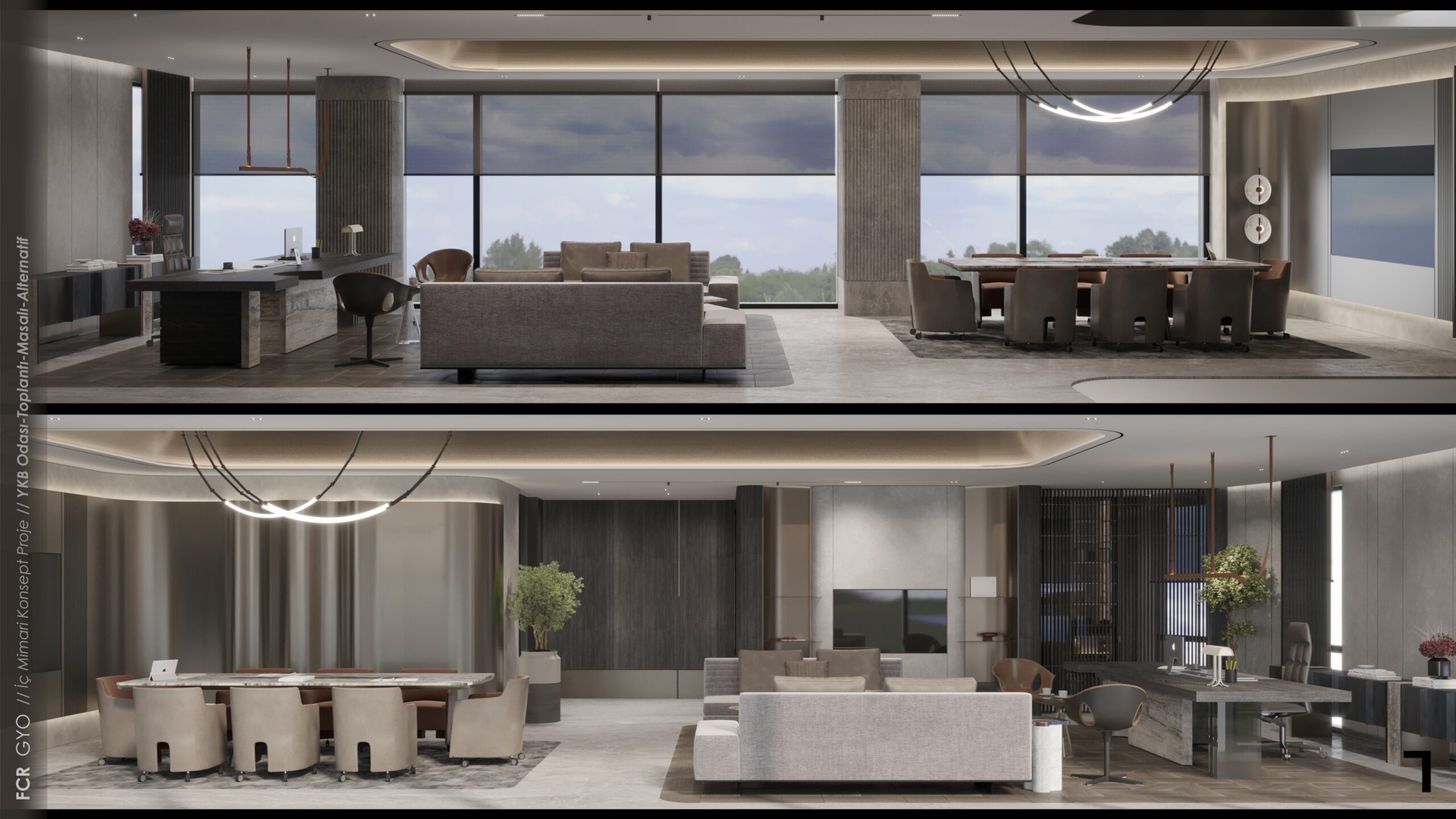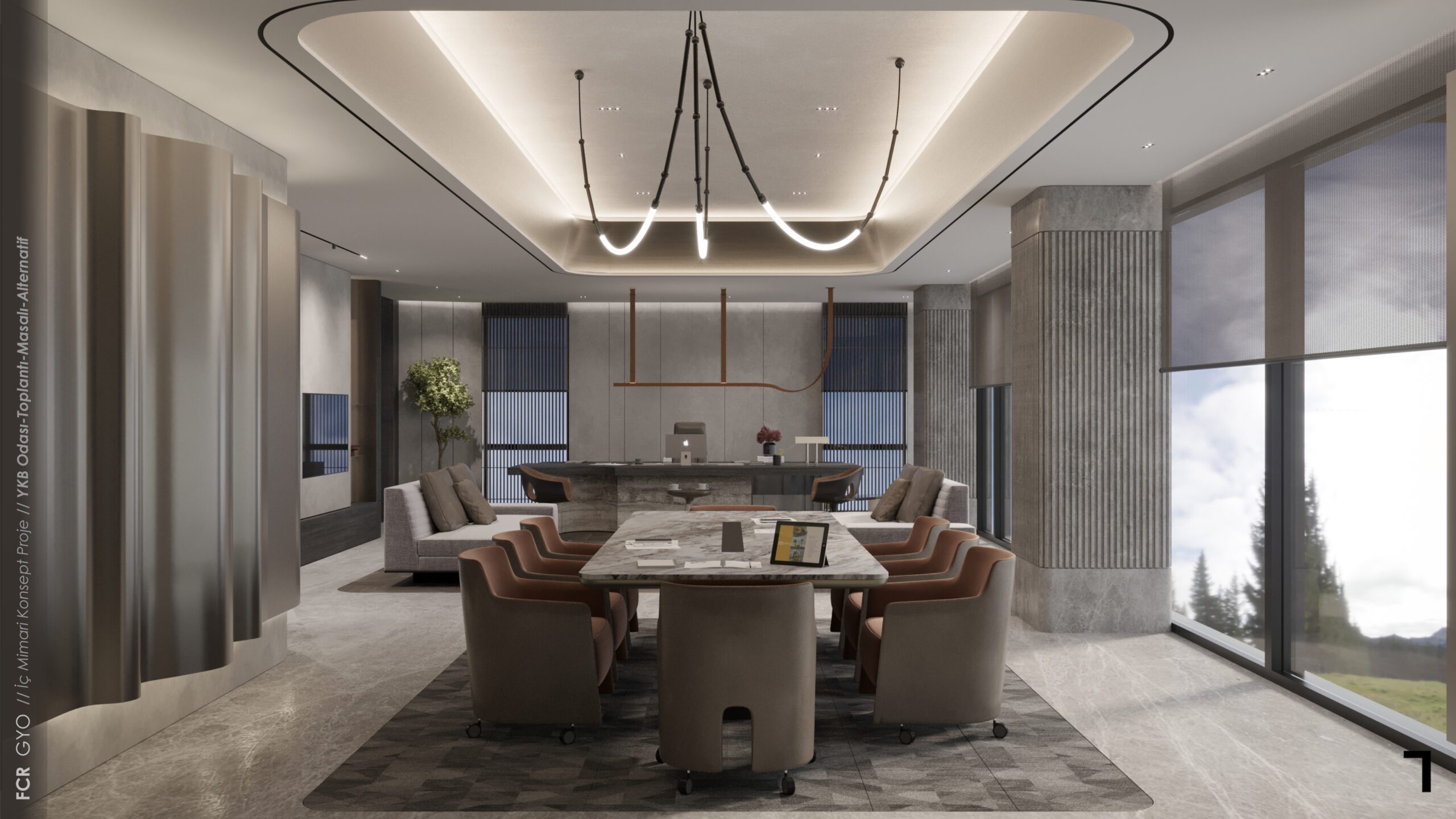 Üst yönetime ayrılan bölüm, karar alma süreçlerine uygun, şık ve konforlu bir atmosfer sunmaktadır. Doğal ışık ve geniş oturma alanlarıyla desteklenen iç mimari modern bir bütünlük oluşturur. YKB ofisi ve toplantı salonları ise malzeme geçişleri ve tavan detaylarıyla alanlar arası akışı zarifçe yönlendiren çağdaş bir düzenlemeye sahiptir.